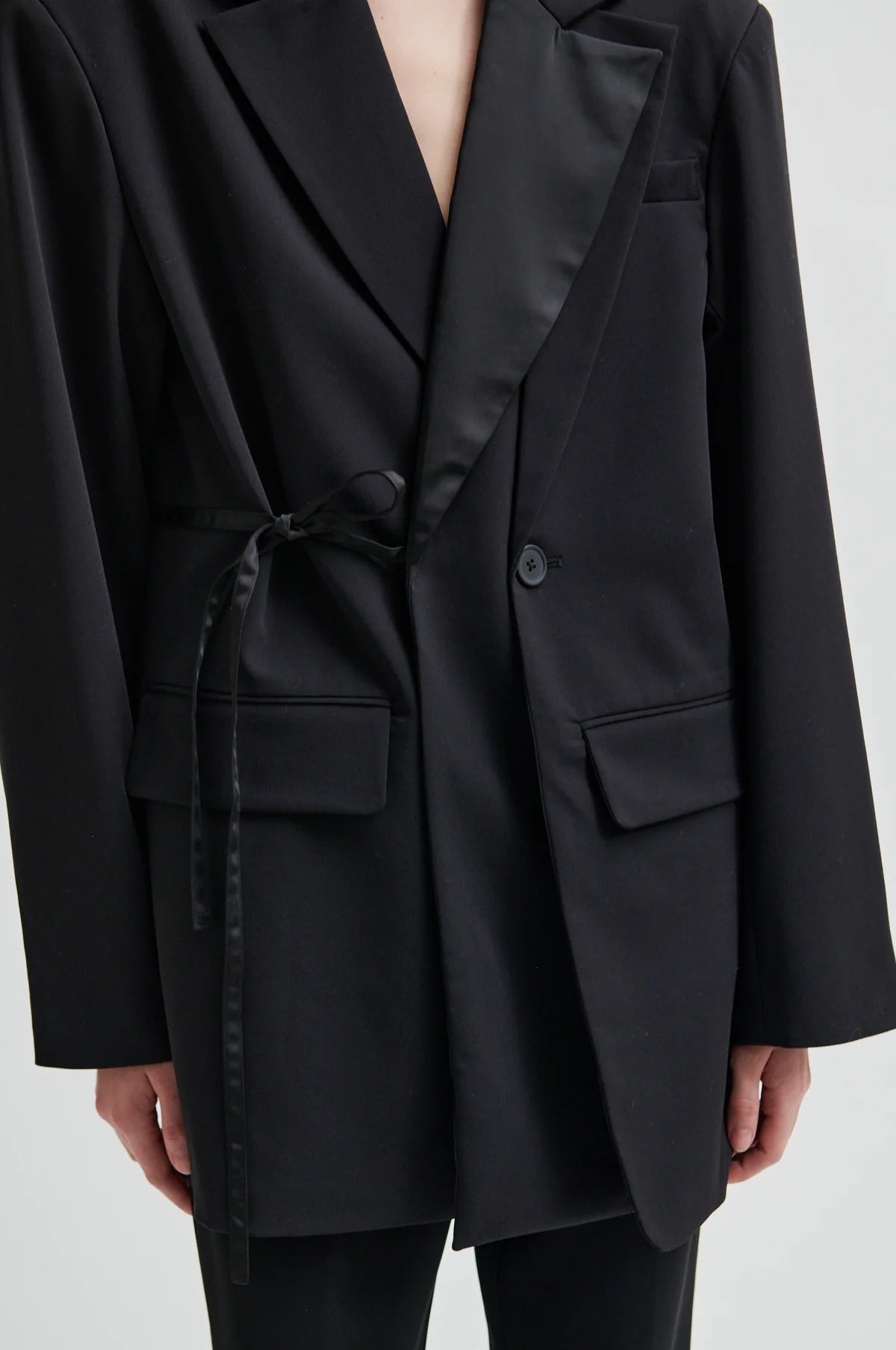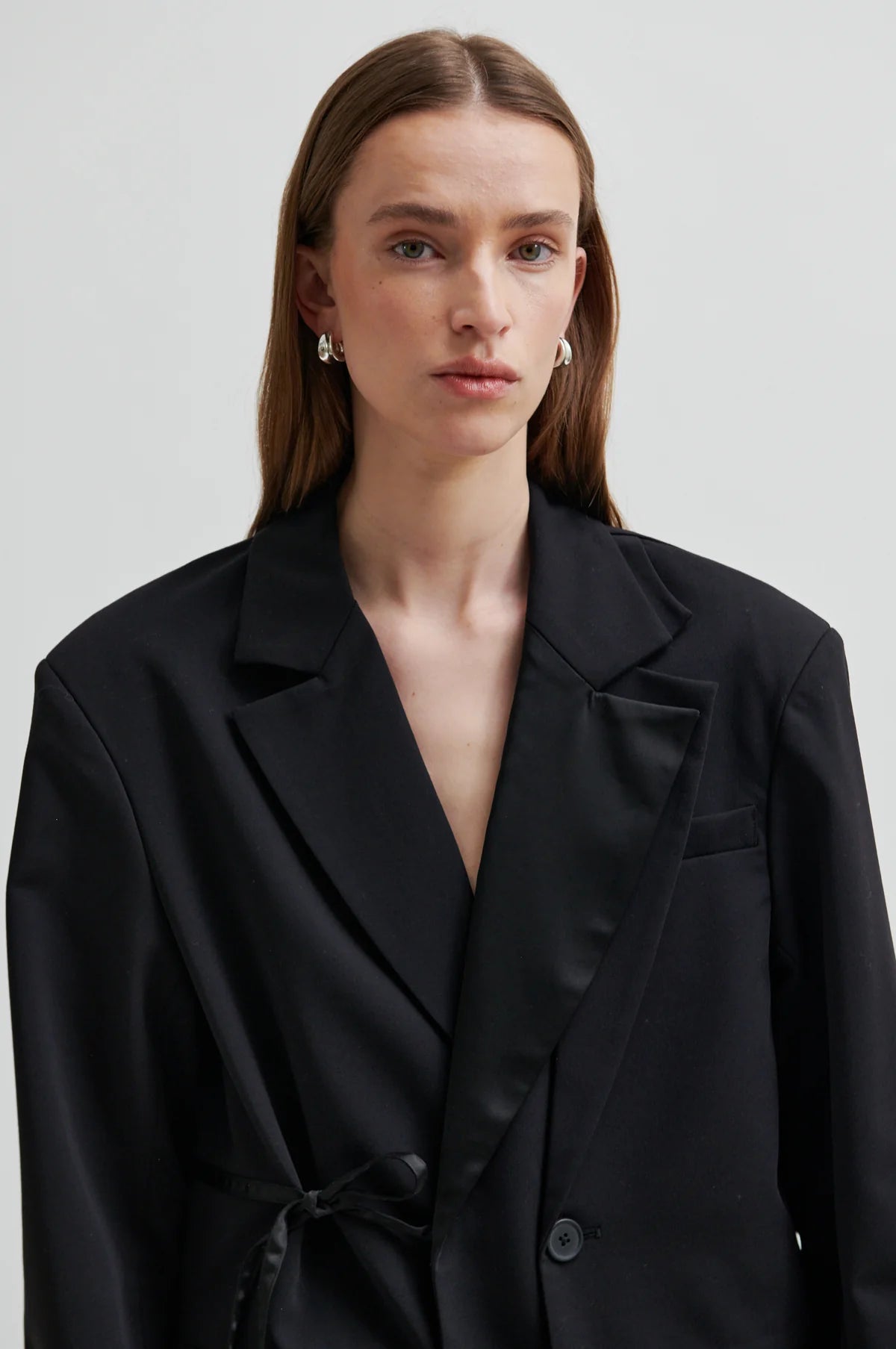 Second Female double blazer. Featuring a peak lapel, tie fastening and padded shoulders. Double layer effect on one side. Single chest pocket and two flap pockets. Long sleeves with slits at cuffs. Fully lined. Straight, loose fit.