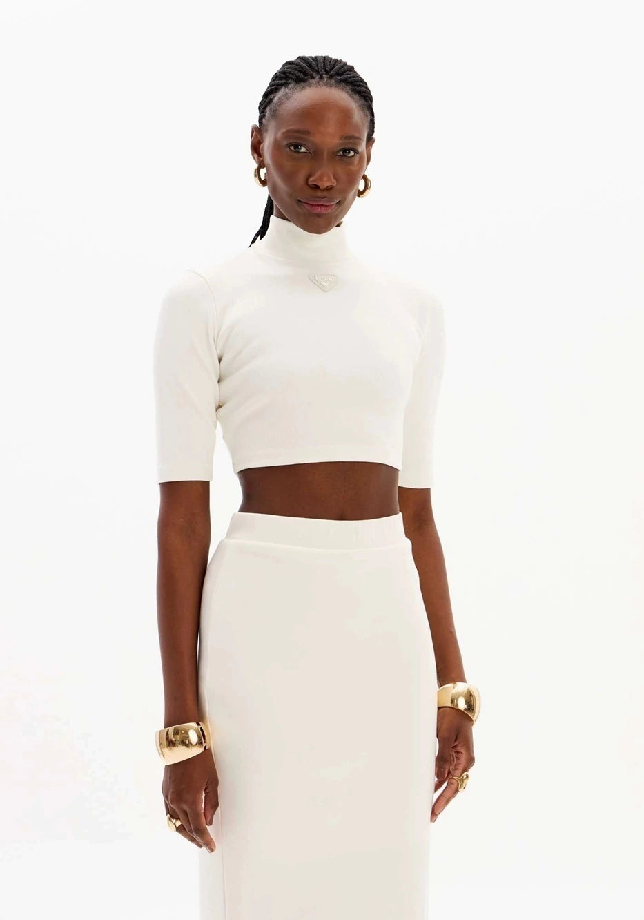 Designed in an elegant off-white tone, this piece combines a modern cropped fit with half sleeves and a high neckline for a sophisticated touch. The ribbed texture flatters the silhouette, while the delicate front embroidery adds exclusivity and charm.